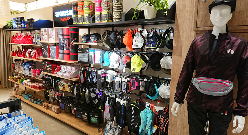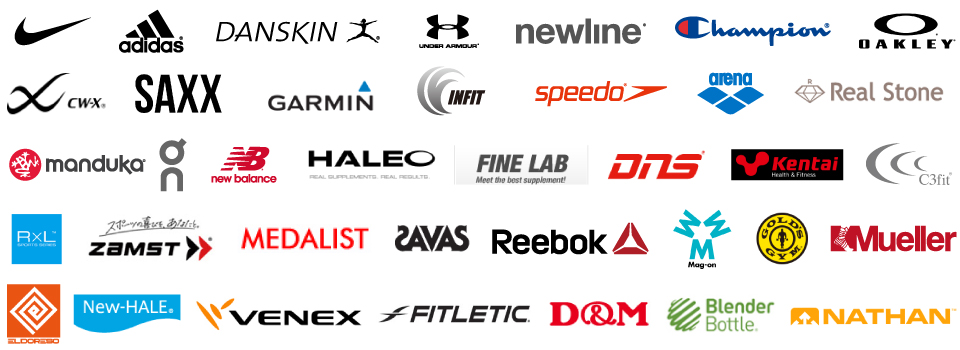 ナイキ/アディダス/ダンスキン/アンダーアーマー/ニューライン/チャンピオン/オークリー/CW-X(シーダブリュー・エックス)/SAXX(サックス)/ガーミン/infit(インフィット・自社ブランド)/スピード/アリーナ/リアルストーン/マンドゥカ/On(オン)/ニューバランス/ハレオ/ファインラボ/DNS(ディーエヌエス)/ケンタイ/C3fit(シースリーフィット)/R×L(アールエル)/ザムスト/メダリスト/ザバス/リーボック/マグオン/ゴールドジム/ミューラー/エルドレッソ/ニューハレ/ベネクス/フィットレティック/D&M/ブレンダーボトル/ネイサン