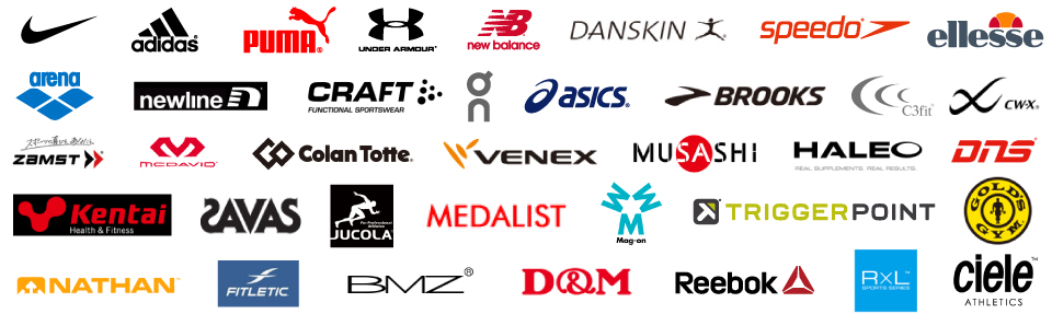 ナイキ /アディダス/プーマ/アンダーアーマー/ニューバランス/ダンスキン/スピード/エレッセ/アリーナ/ニューライン/クラフト/オン/アシックス/ブルックス/シースリーフィット/シーダブリューエックス/ザムスト/マクダビッド/コラントッテ/べネクス/ムサシ/ハレオ/DNS(ディーエヌエス)/ケンタイ/ザバス/ジャコラ/メダリスト/マグオン/トリガーポイント/ゴールドジム/ネイサン/フィットレティック/BMZ(ビーエムゼット)/D&M(ディーエム)/リーボック/R×L(アールエル)/シエール